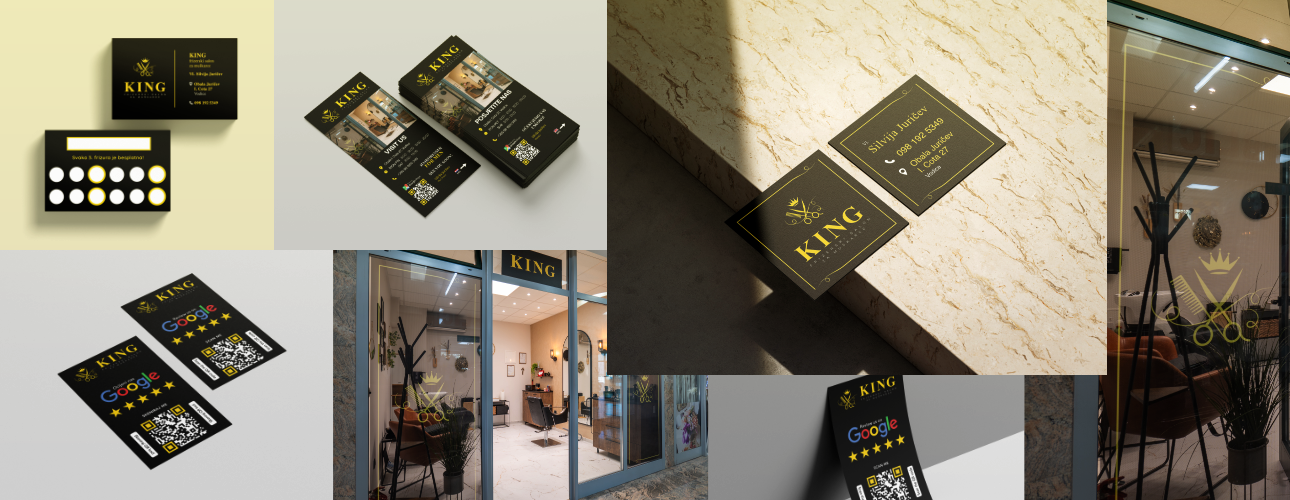Uz branding i logo, za KING frizerski salon sam dizajnirao niz tiskanih materijala od vizitki, letaka, naljepnica, kartica pa sve do vanjskih oglasnih ploča i natpisa.